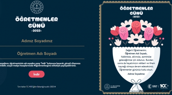Söz konusu internet adresine girerek kutlama kart? olu?turmak isteyen vatanda?lar, kendi ad-soyad?n? ve ö?retmenin ad-soyad?n? yazd?ktan sonra "?ndir" butonuna basarak kutlama kart? görselini cihazlar?na yükleyebiliyor ve sosyal medya hesaplar?ndan #ö?retmenlergünü etiketiyle payla?abiliyor.