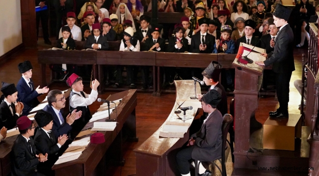Döneme özgü k?yafetlerle birlikte tarihî Birinci Mecliste bir araya gelen ö?renciler, temsili olarak dualar e?li?inde Türk milletinin iradesini temsil eden Birinci Büyük Millet Meclisini açt?.