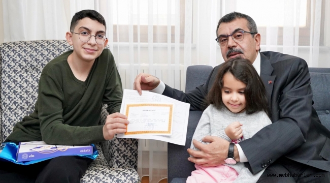 Bakan Tekin, Hatay'daki depremde babas?n? ve iki karde?ini kaybeden, deprem etkisiyle ya?ad??? sa?l?k problemleri nedeniyle evde e?itim alan Hasan Bu?ra Genç'e karnesi ve takdir belgesini Hasan Bu?ra'n?n 5 ya??ndaki karde?i Zeynep ile birlikte verdi.