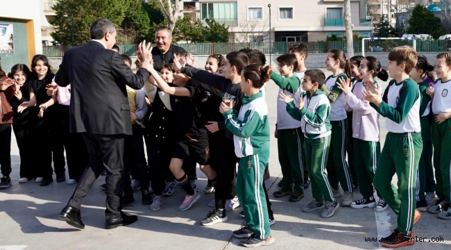 Okulda ö?renci ve ö?retmenler taraf?ndan kar??la??lan Bakan Tekin, beden e?itimi dersini bahçede i?leyen ve basketbol oynayan ö?rencilerin yan?na giderek sohbet etti, ö?rencilerin iste?i üzerine basketbol toplar?na imza att?.