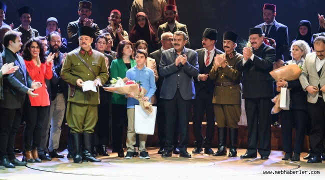 ?zleyicilerin ayakta alk??lad??? oyunun ard?ndan sahneye ç?kan Bakan Tekin, tüm ekibe tebriklerini iletti, oyunculara hediye ve çiçek takdim etti.
