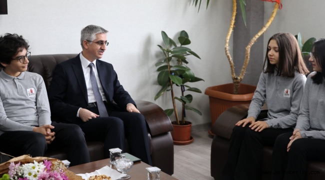 Bakan Yard?mc?s? Y?lmaz, Mu? Millî E?itim Müdürlü?ünde ö?renciler Zeynep Nehir Çaml?ca, Dil?ah ?mran Avc?, Baver Bedirhan Bingöl ve Proje Koordinatörü Ö?retmen Birsen Geçer'le bulu?tu.