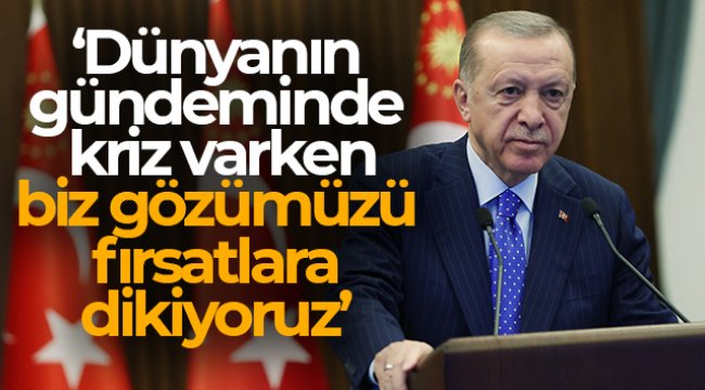 Küresel krizin Türkiye'nin gündeminde olmad???n? söyleyen Cumhurba?kan? Erdo?an, "Son 20 y?lda ülkemizi demokrasi ve kalk?nma ray?ndan ç?kar?p yeniden eski günlerine döndürmek için pek çok deneme yap?ld? ama hamdolsun. Birli?imize, beraberli?imize, karde?li?imize s?k? s?k?ya sar?larak bu alçak gayretlerin hepsini de bo?a ç?kard?k. Bu sayede ülke olarak küresel, siyasi ve ekonomik düzenin önce salg?n, sonra sava? ?artlar?n?n getirdi?i dalgalanmalarla kökünden sars?ld??? bir dönemde gelece?imize güvenle bakabiliyoruz. Herkes küçülmeden dert yanarken biz büyümeyi konu?uyoruz. Dünyan?n gündeminde kriz varken biz gözümüzü f?rsatlara dikiyoruz" aç?klamas?n? yapt?.