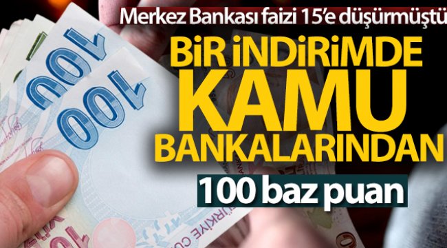 Türkiye Cumhuriyet Merkez Bankas?'n?n (TCMB) dünkü faiz indirimi karar?n?n ard?ndan kamu bankalar? harekete geçti. Buna göre kamu bankalar?, kurumsal kredi faiz oranlar?nda 100 baz puana kadar indirim yapt?. Konut kredilerinde de indirime giden kamu bankalar?, s?f?r konutlar için kredi faiz oranlar?n?, bugünden geçerli olmak üzere 1 milyon TL alt? tutarlarda yüzde 1,20'ye, 1 milyon TL üzerindeki tutarlarda ise yüzde 1,29'a dü?ürdü.