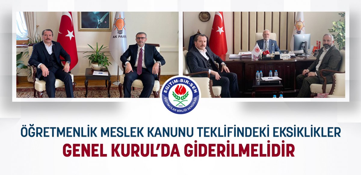 E?itim-Bir-Sen ve Memur-Sen Genel Ba?kan? Ali Yalç?n ve E?itim-Bir-Sen Genel Ba?kan Yard?mc?s? Hasan Yalç?n Yayla, TBMM Genel Kurulu’nda görü?ülmesi beklenen Ö?retmenlik Meslek Kanunu teklifi konusunda AK Parti Grup Ba?kan vekilleri Mahir Ünal ve Mustafa Elita? ile görü?tü.