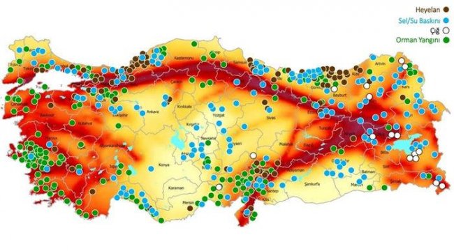 ?çi?leri Bakanl??? Afet ve Acil Durum Yönetimi Ba?kanl??? (AFAD), Türkiye’de meydana gelen do?a kaynakl? afetleri kay?t alt?na alarak afet risk haritas? ç?kard?. Bu haritaya göre Türkiye’de geçen y?l 107 sel/su bask?n?, 66 orman yang?n?, 16 kar/tipi, 39 heyelan meydana gelirken, Karadeniz bölgesi a??r? ya??? ve heyelan ile Ege ve Akdeniz ise orman yang?nlar? ile mücadele etti.